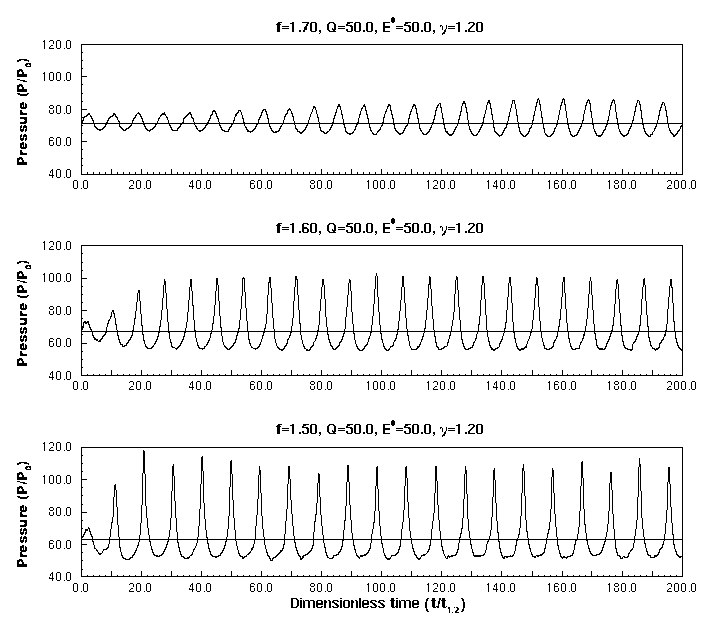 In one space dimension ZND detonations are either stable or unstable to some perturbation. The result of the perturbations, if the detonation is unstable, is a pulsating mode instability. The following figures illustrates this behaviour for several unstable detonations. The degree of instablity is controlled by decreasing the speed of propagation of the wave. The lower the speed of propagation, for a given heat release and activation energy, the more unstable the detonation becomes.